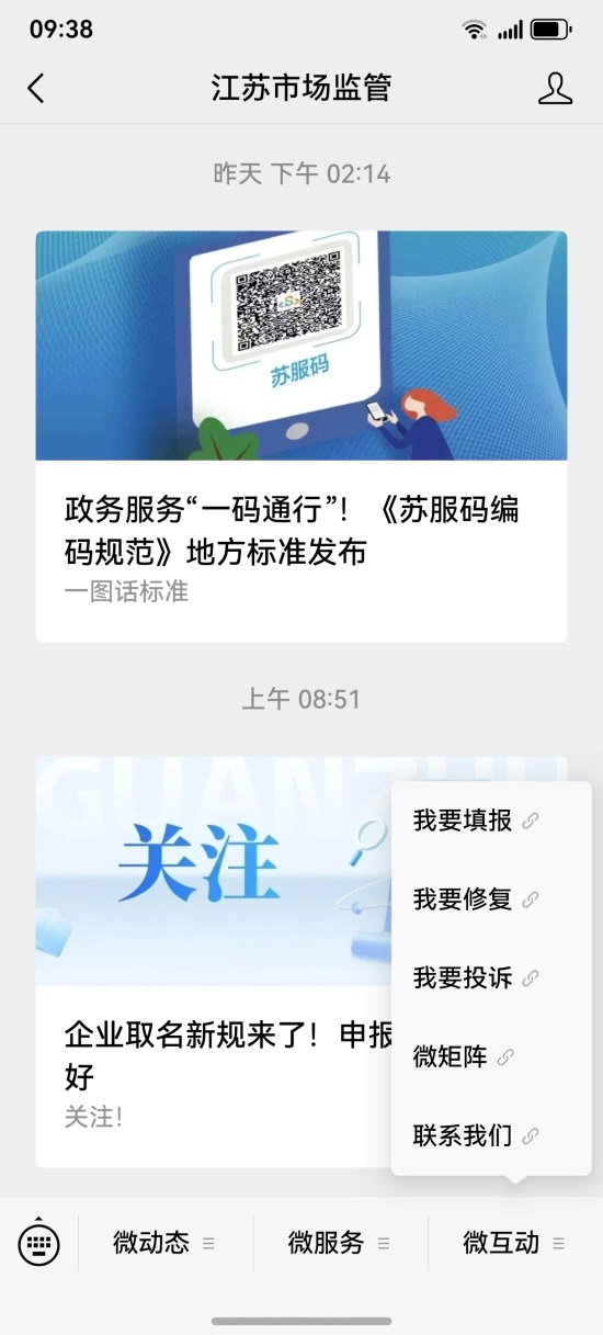 关注“江苏市场监管”公众号,点击“微互动”中的“我要填报”